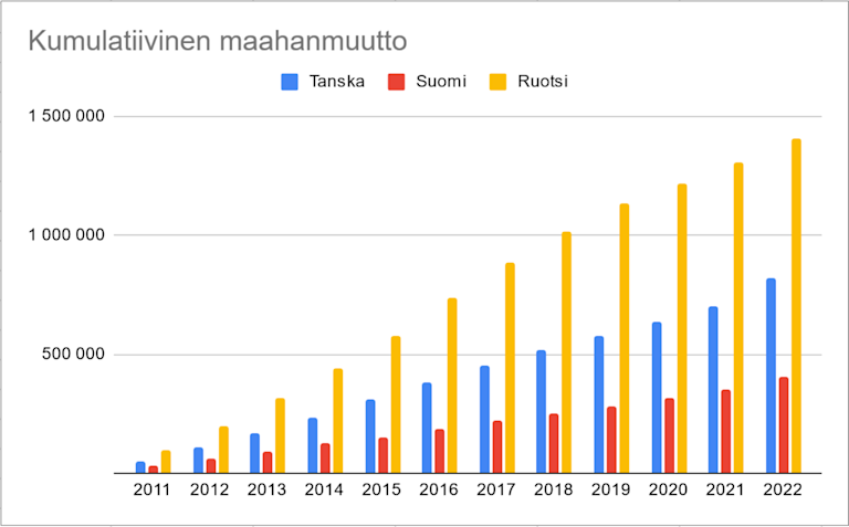 Tanskassa on suurin piirtein yhtä paljon ihmisiä kuin Suomessa, mutta sinne muuttaa vuosittain kaksi kertaa enemmän ihmisiä kuin Suomeen. Koska tämä on jatkunut jo vuosikymmeniä, se tarkoittaa montaa sataa tuhatta maahanmuuttajaa enemmän kuin mitä Suomessa on.