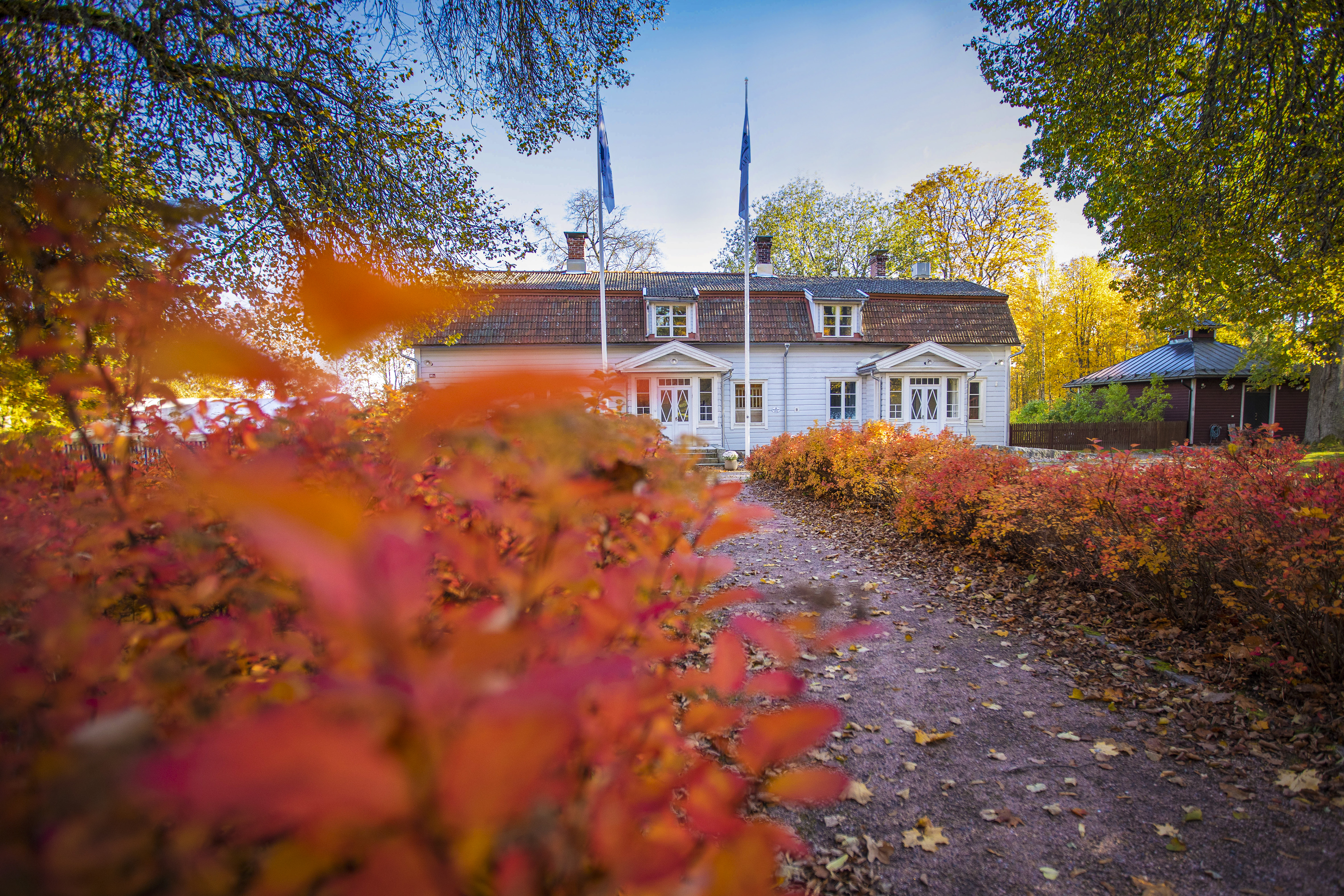 ![Valkoiset ulkoportaat, jotka johtavat tielle, joka vie talolle.]()